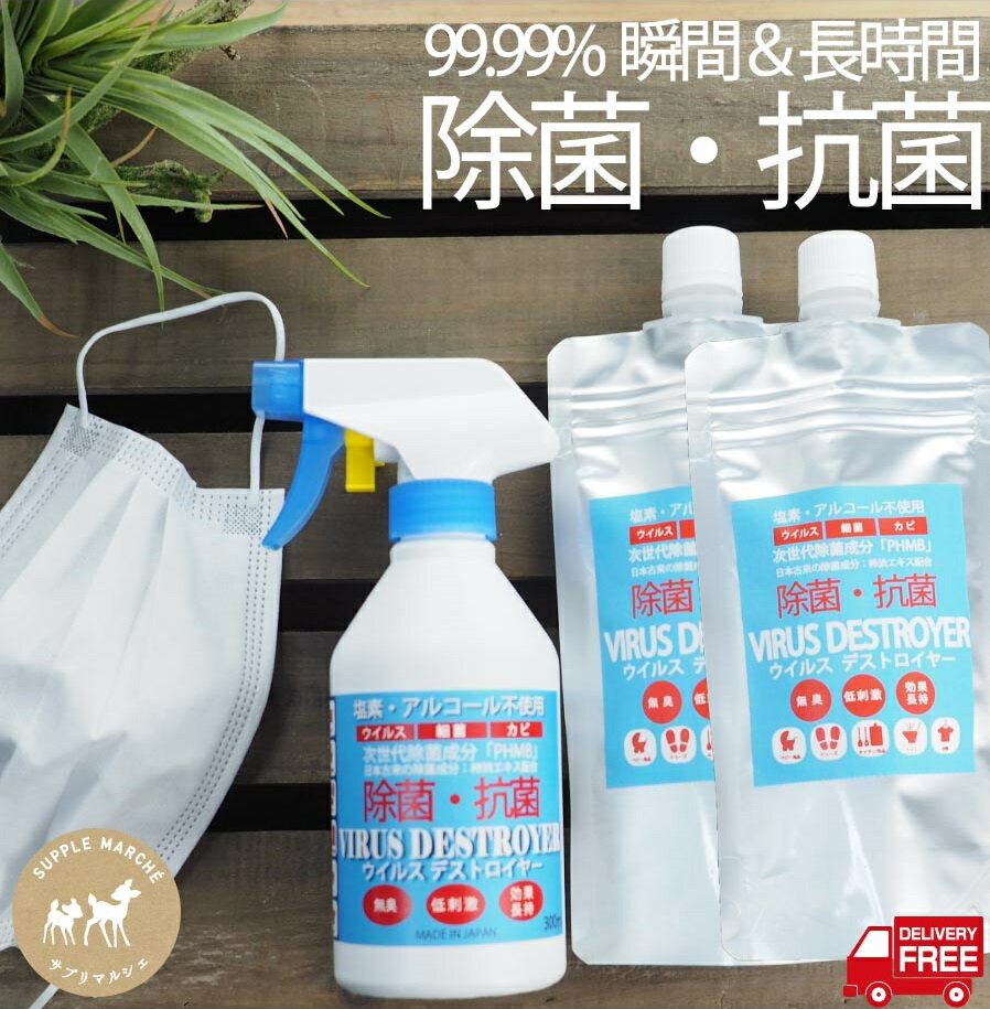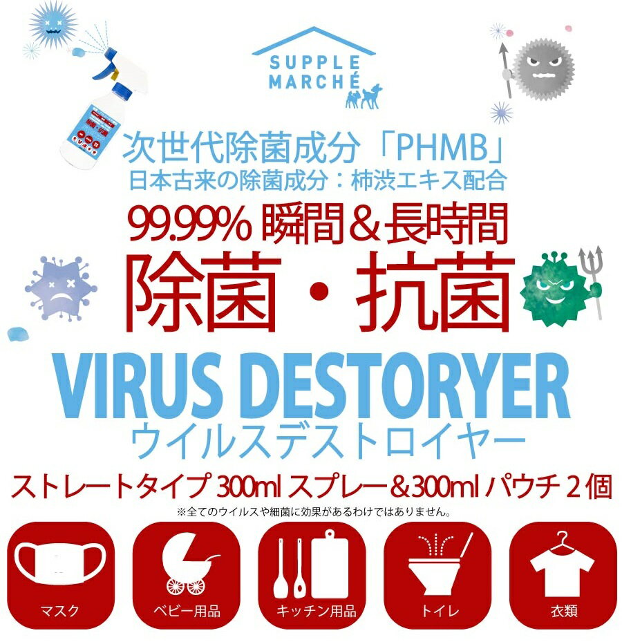 商品詳細 商品名 ウイルスデストロイヤースプレーボトル300ml 1本+詰替え用パウチ300ml 2本 原材料名 ポリヘキサメチレンビグアナイド、パンシル(柿渋エキス) 内容量 スプレーボトル300ml 1本+パウチ300ml 2本 ご使用方法 商品裏面をご確認ください。